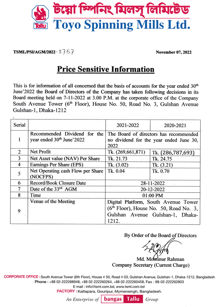 Price Sensitive Information of Toyo Spinning Mils Ltd.
