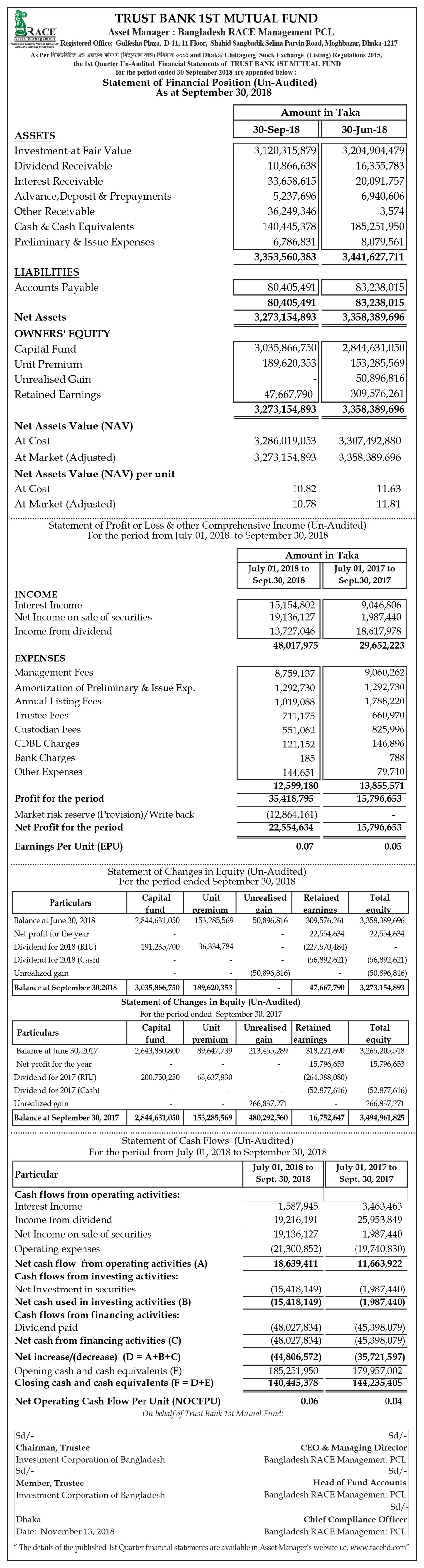 Statements of Financial Position (Un-audited) of Trust Bank 1st Mutual Fund