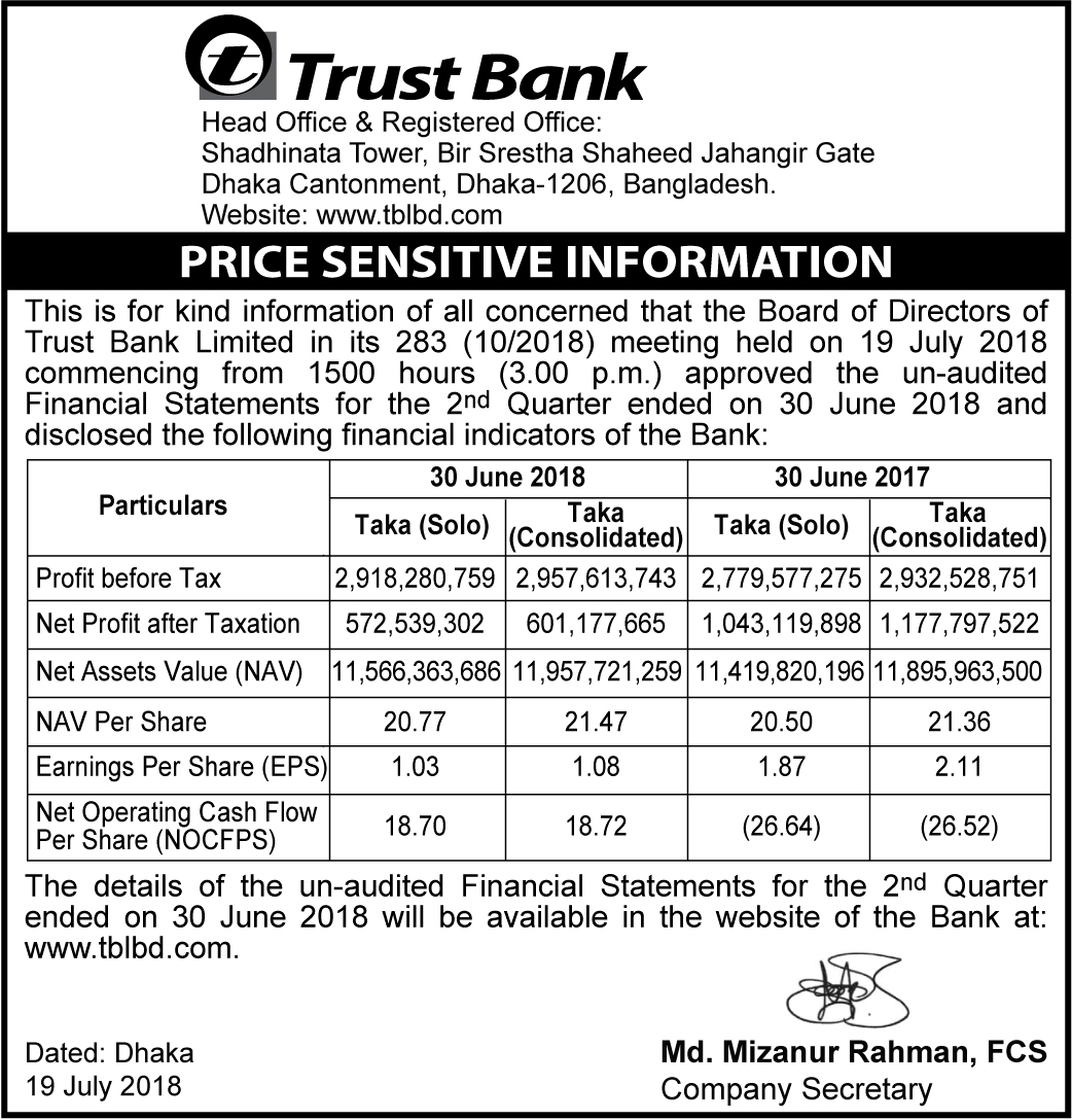 Q2 Unaudited Financial Statements of Trust Bank Limited