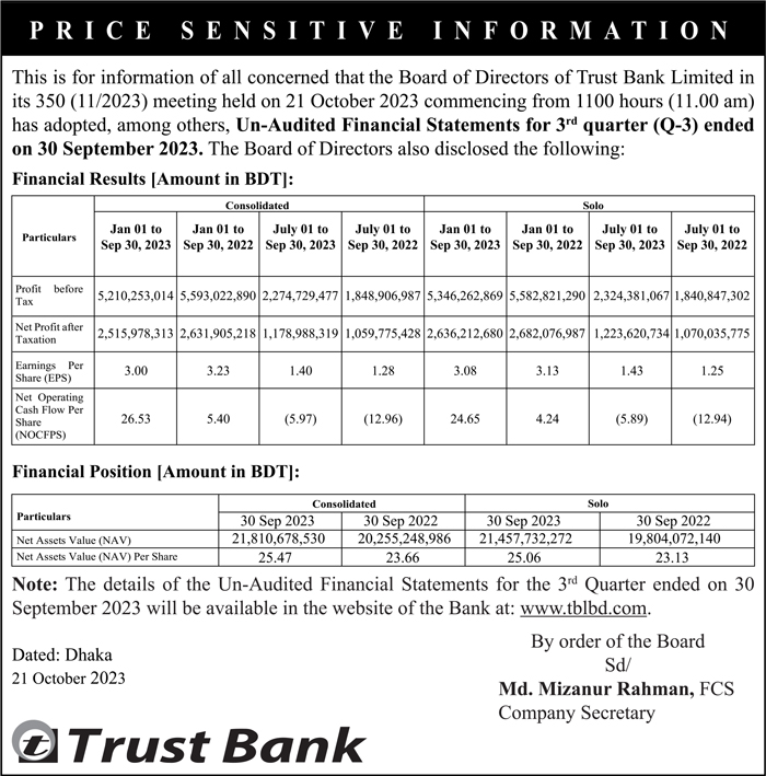 Q3 (Un-audited) Financial Statements of Trust Bank Limited