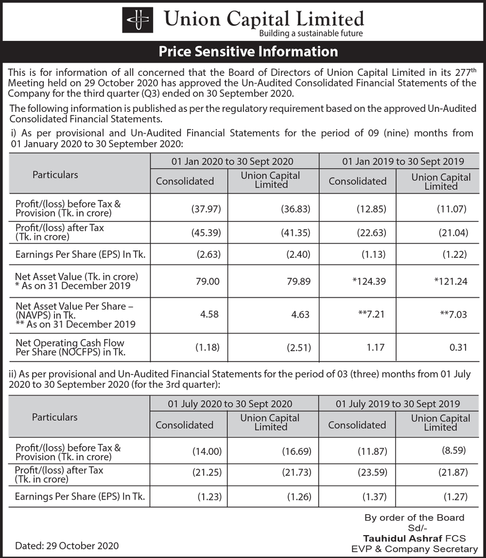 Price Sensitive Information for the First Quarter 2025 of Union Capital Limited