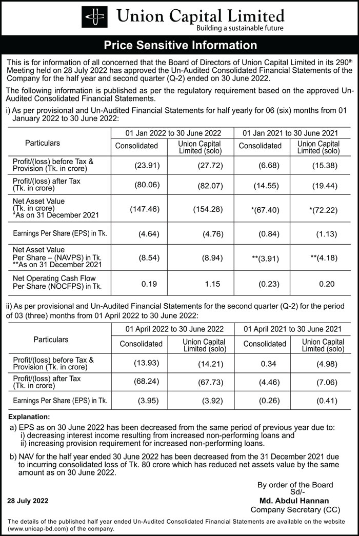 Price Sensitive Information for the First Quarter 2025 of Union Capital Limited