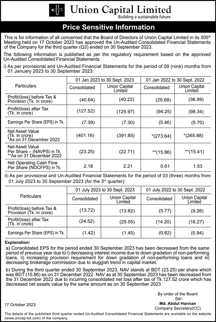 Price Sensitive Information for the First Quarter 2025 of Union Capital Limited