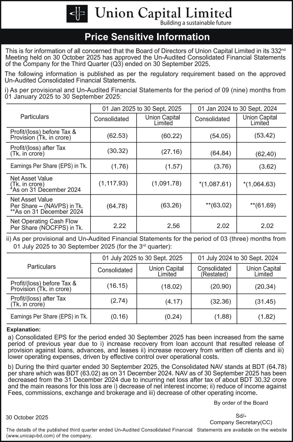 Price Sensitive Information of Union Capital Limited