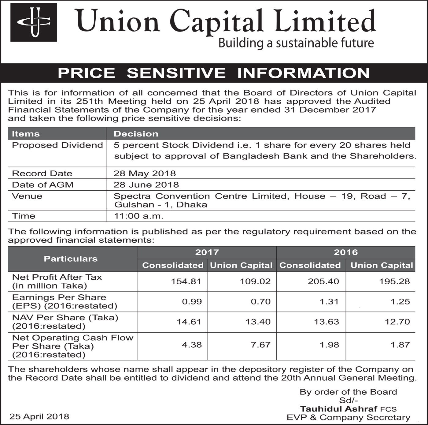 Price Sensitive Information for the First Quarter 2025 of Union Capital Limited
