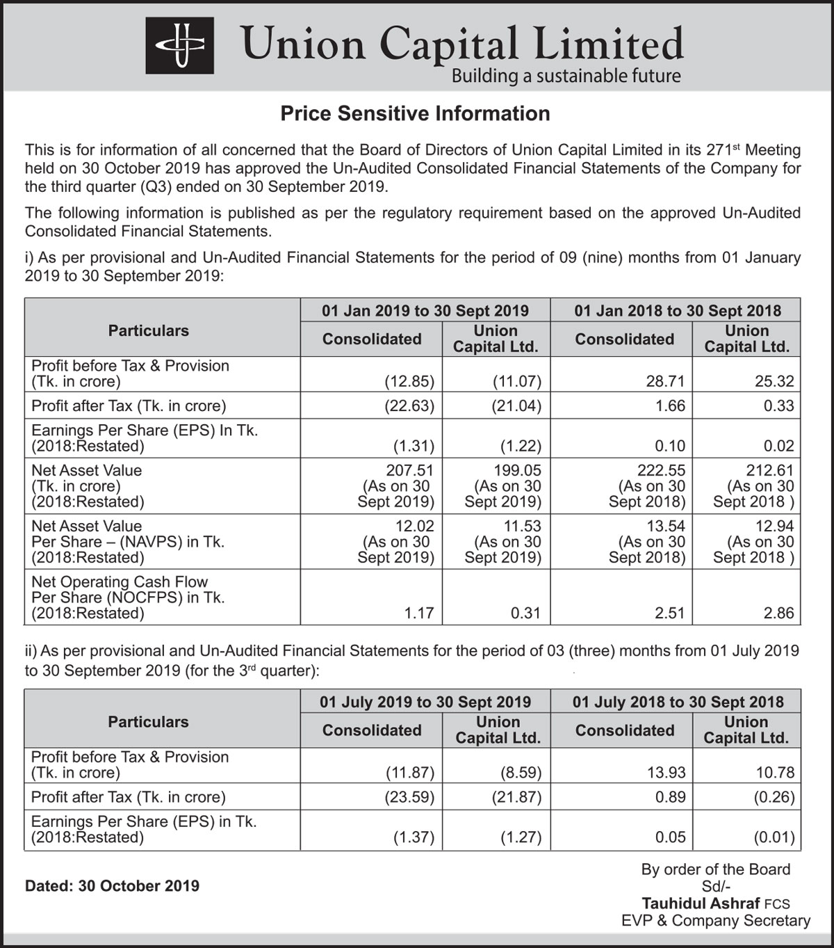 Price Sensitive Information for the First Quarter 2025 of Union Capital Limited