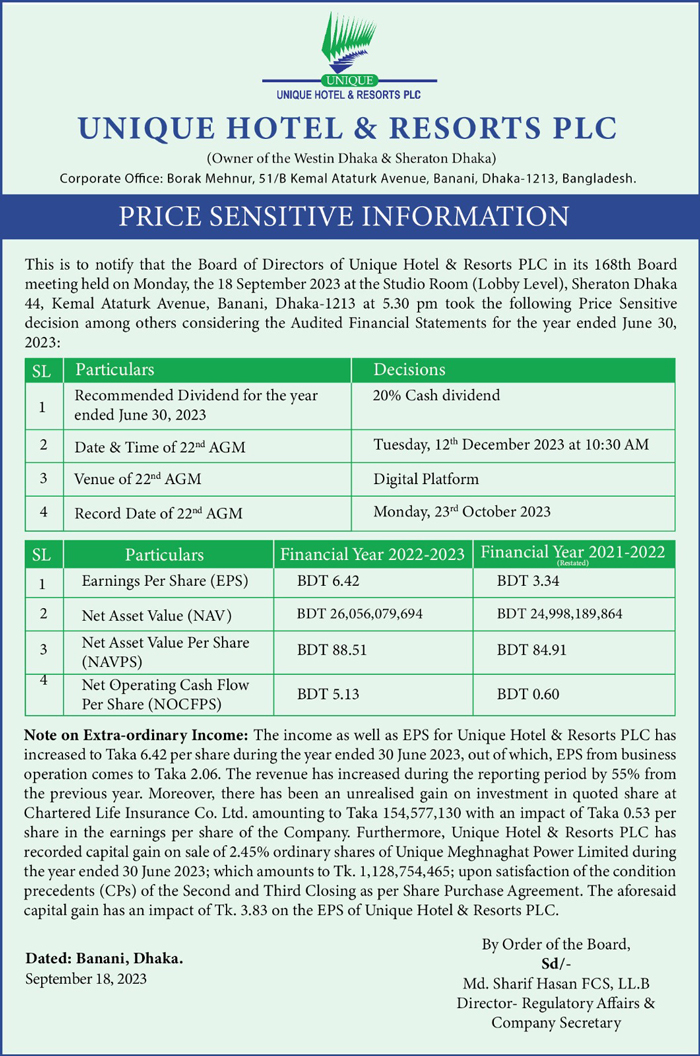 Price Sensitive Information of Unique Hotel & Resorts PLC