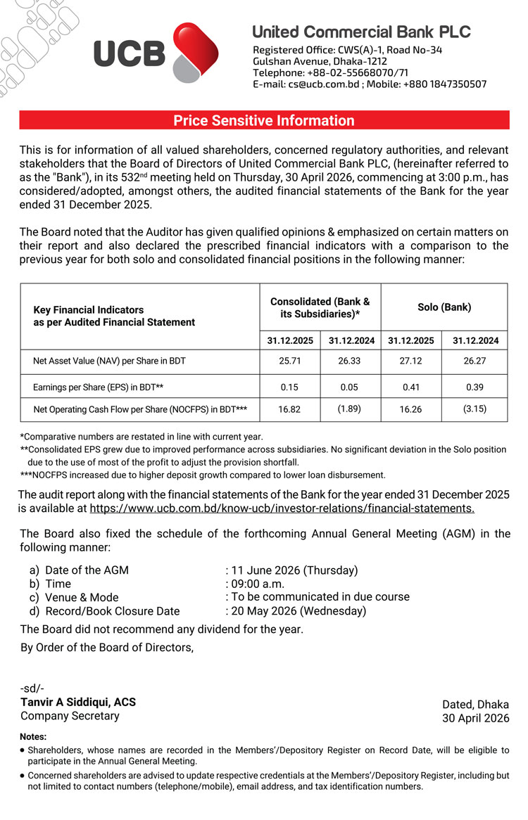 Price Sensitive Information of United Commercial Bank (UCB)