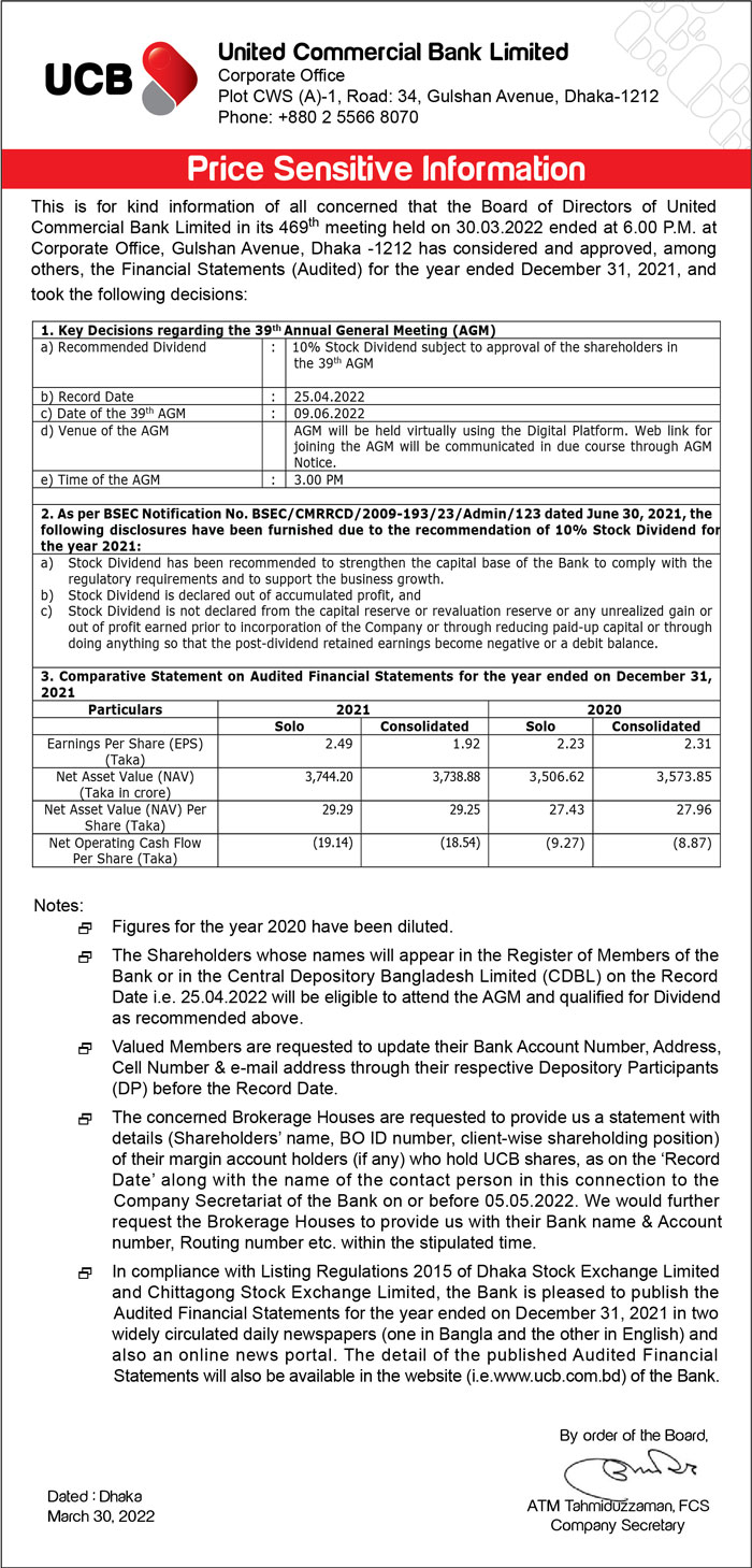 Price Sensitive Information of United Commercial Bank PLC (UCB)