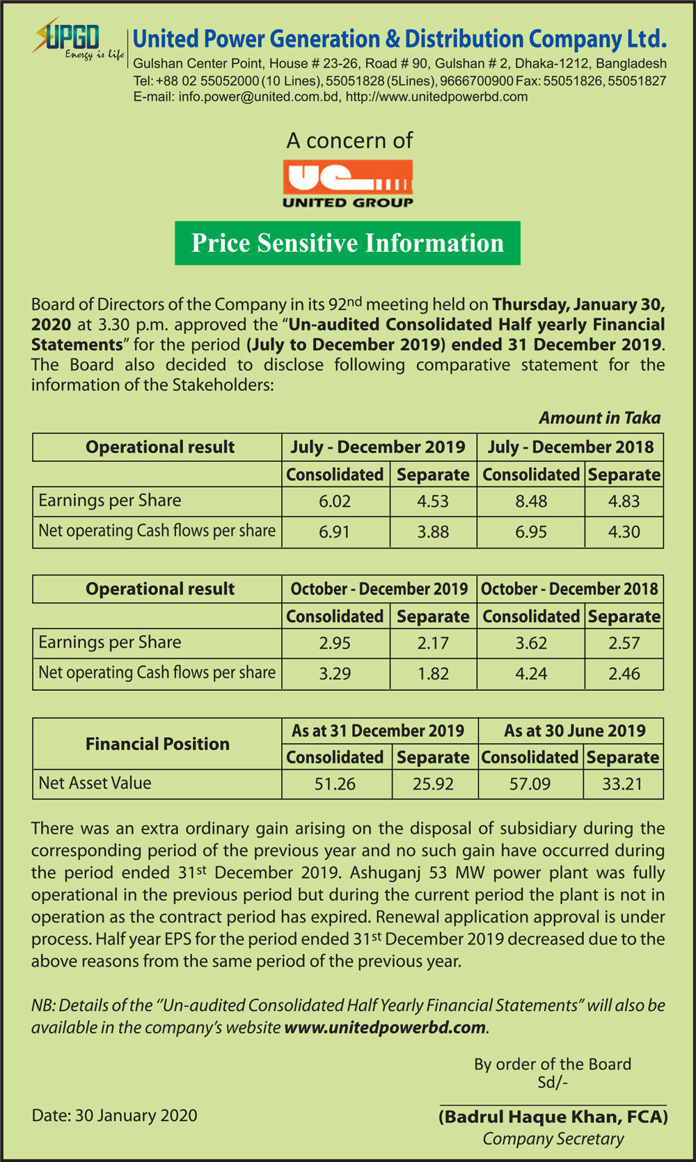Price Sensitive Information of United Power Generation & Distribution Company Ltd