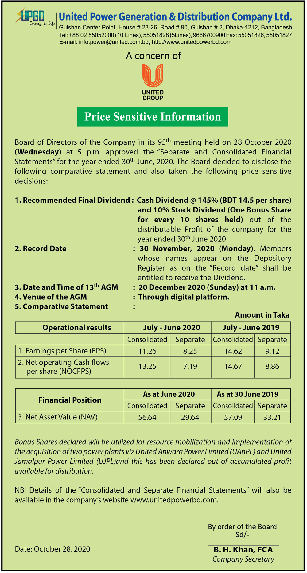 Price Sensitive Information of United Power Generation & Distribution Company Ltd