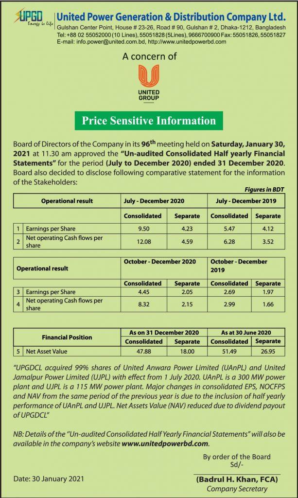 Price Sensitive Information of United Power Generation & Distribution Company Ltd