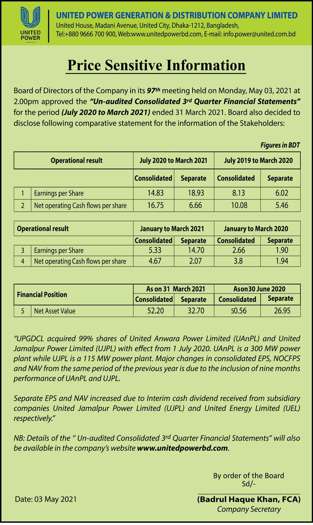 Price Sensitive Information of United Power Generation & Distribution Company Ltd
