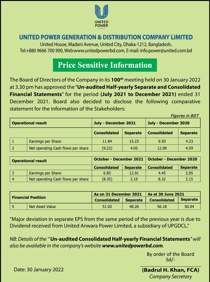 Price Sensitive Information of United Power Generation & Distribution Company Ltd