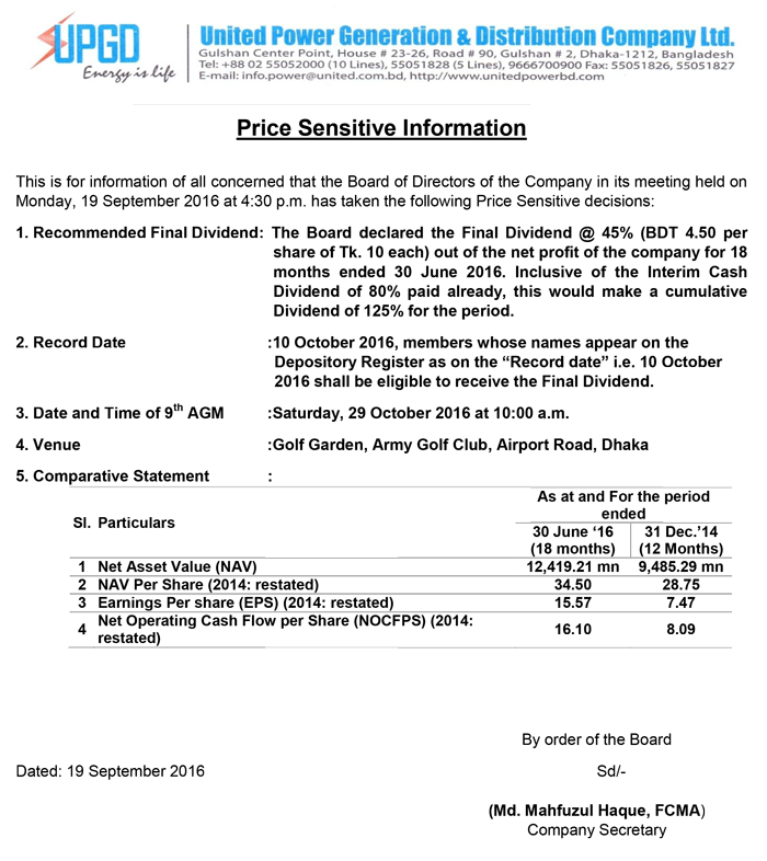 Price Sensitive Information of United Power Generation & Distribution Company Ltd