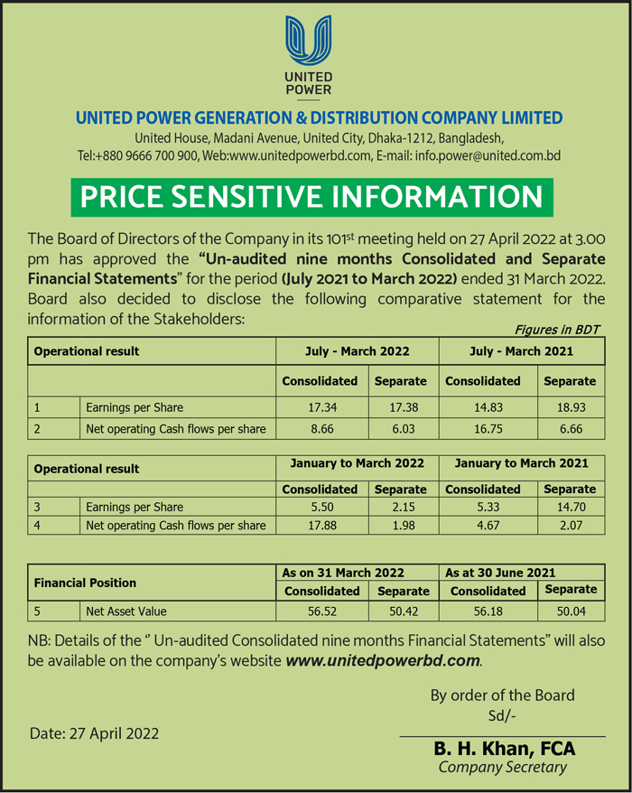Price Sensitive Information of United Power Generation & Distribution Company Ltd