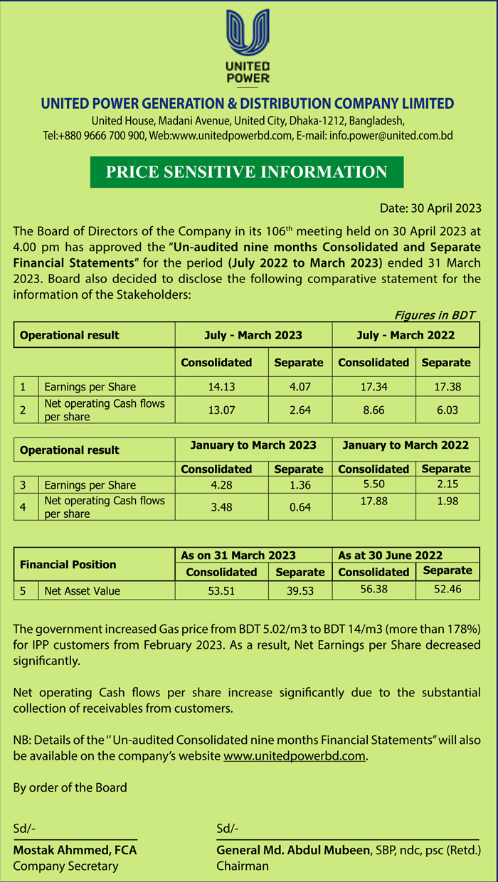 Price Sensitive Information of United Power Generation & Distribution Company Ltd
