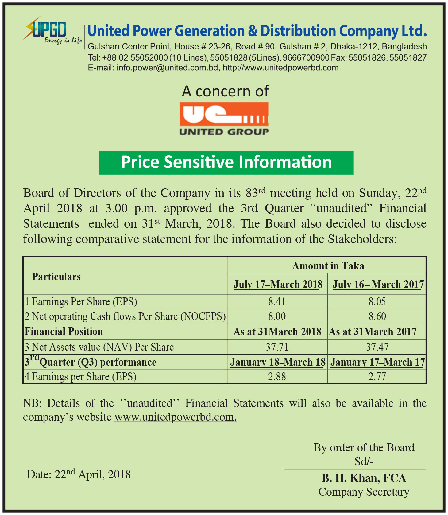 Price Sensitive Information of United Power Generation & Distribution Company Ltd