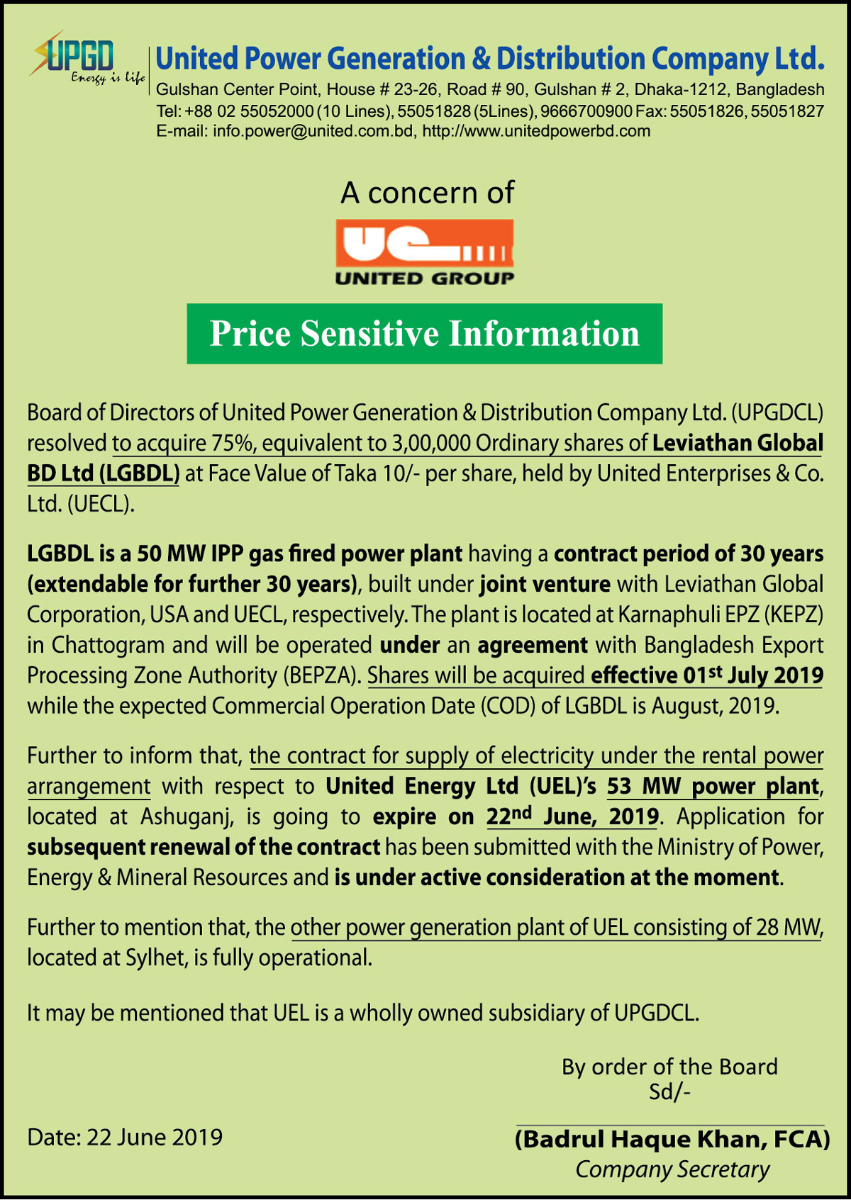 Price Sensitive Information of United Power Generation & Distribution Company Ltd
