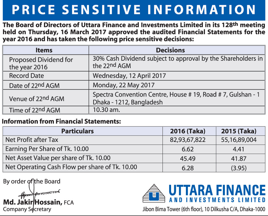 Price Sensitive Information of Uttara Finance and Investments Limited