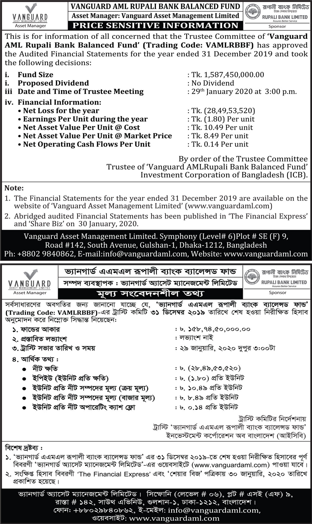 Price Sensitive Information of Vanguard AML Rupali Balanced Fund