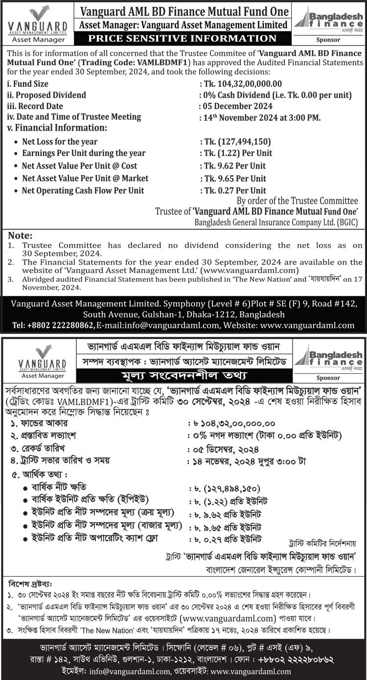 Price Sensitive Information of Vanguard AML BD Finance Mutual Fund One