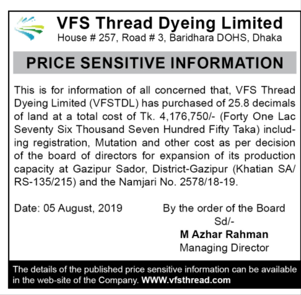Price Sensitive Information of VFS Thread Dyeing Limited