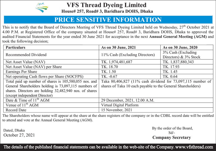 Price Sensitive Information of VFS Thread Dyeing Ltd.