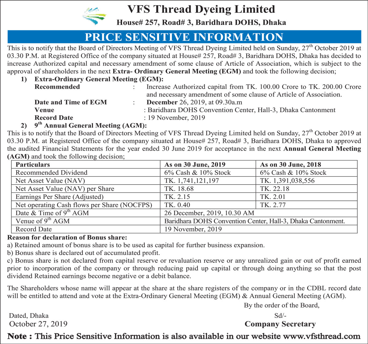 Price Sensitive Information of VFS Thread Dyeing Ltd.