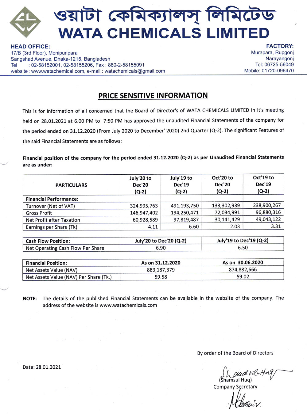 Notice of the 42nd AGM of Wata Chemicals Limited