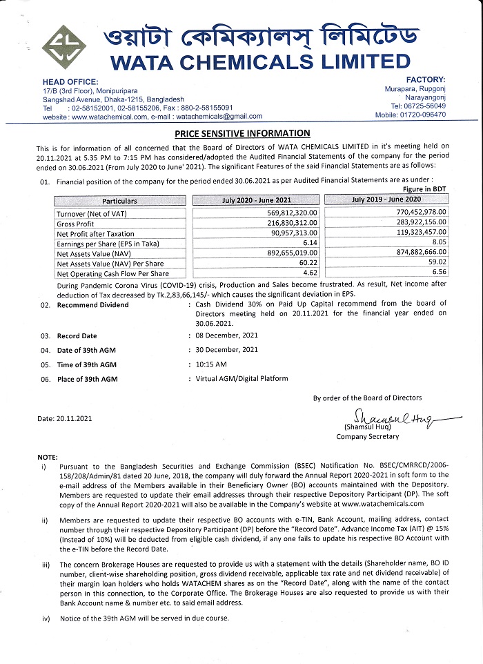 Notice of the 42nd AGM of Wata Chemicals Limited