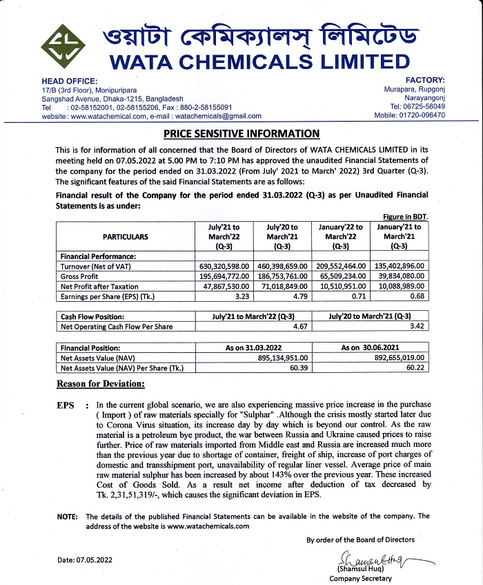 Notice of the 42nd AGM of Wata Chemicals Limited