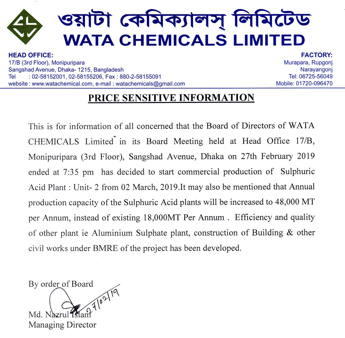 Price Sensitive Information of Wata Chemicals Limited
