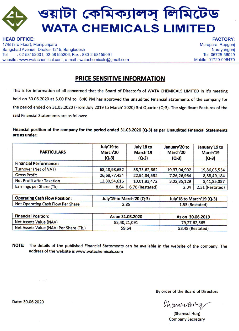 Notice of the 42nd AGM of Wata Chemicals Limited