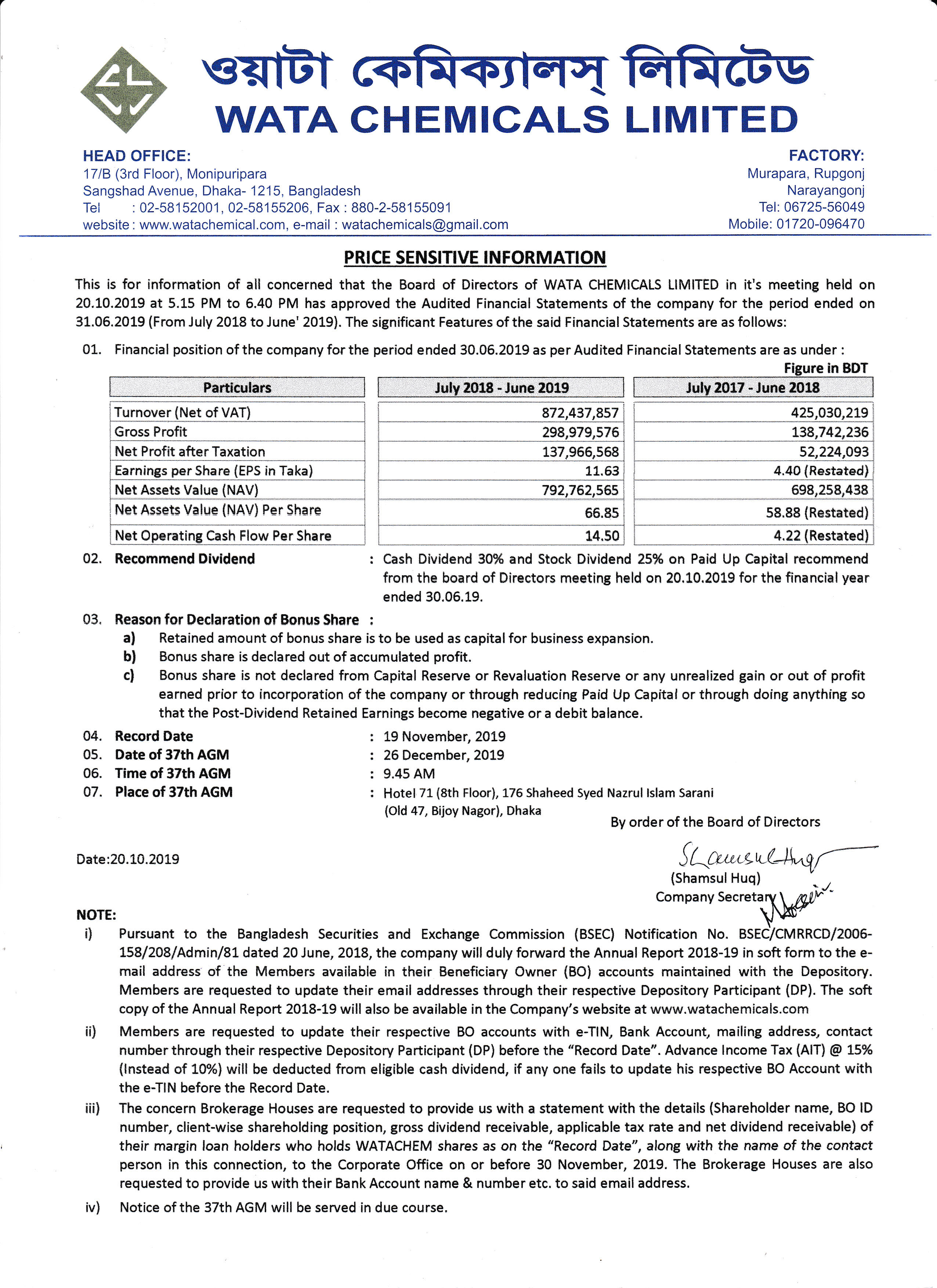 Price Sensitive Information of Wata Chwmicals Ltd.
