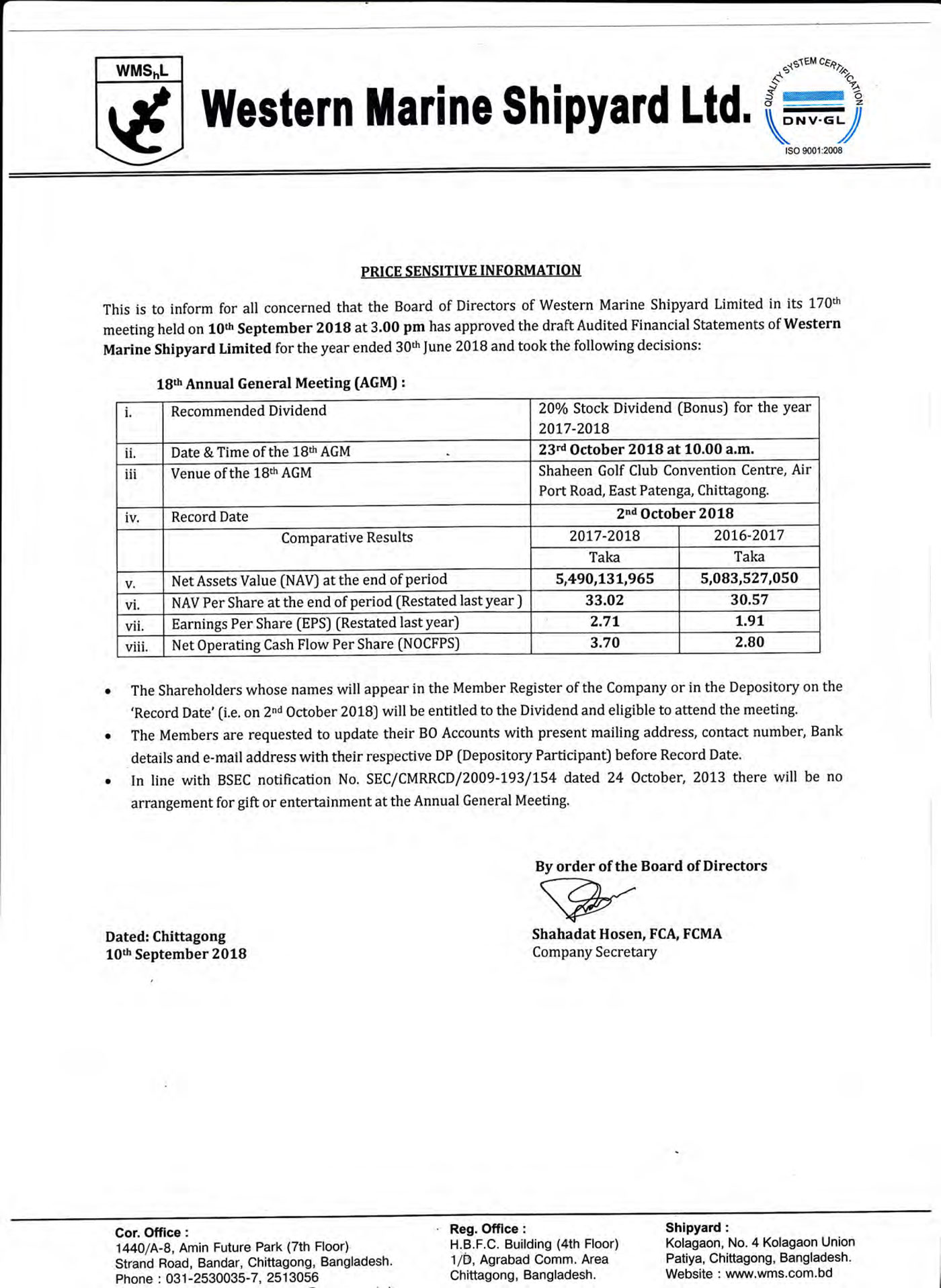 Price Sensitive Information of Western Marine Shipyard Ltd.