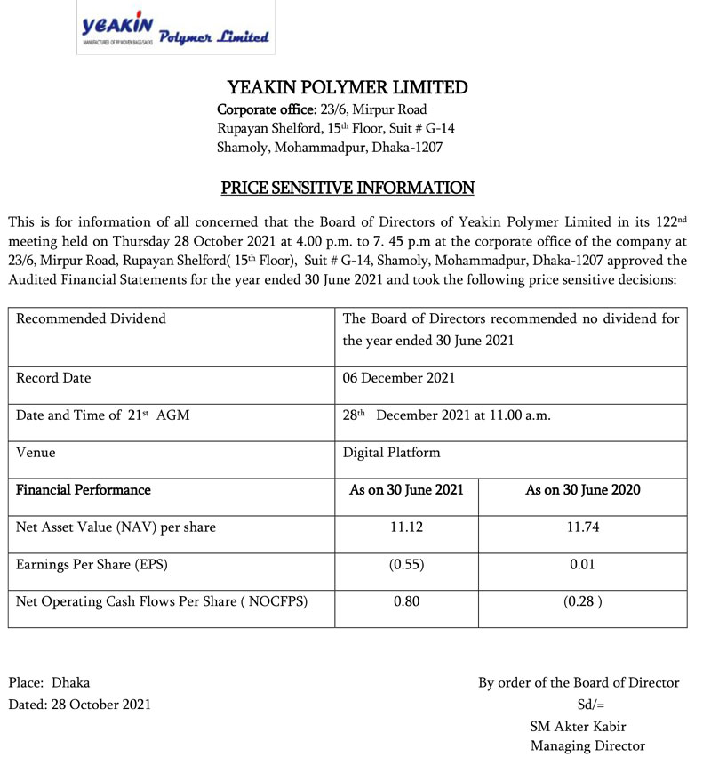 Price Sensitive Information of Yeakin Polymer Limited