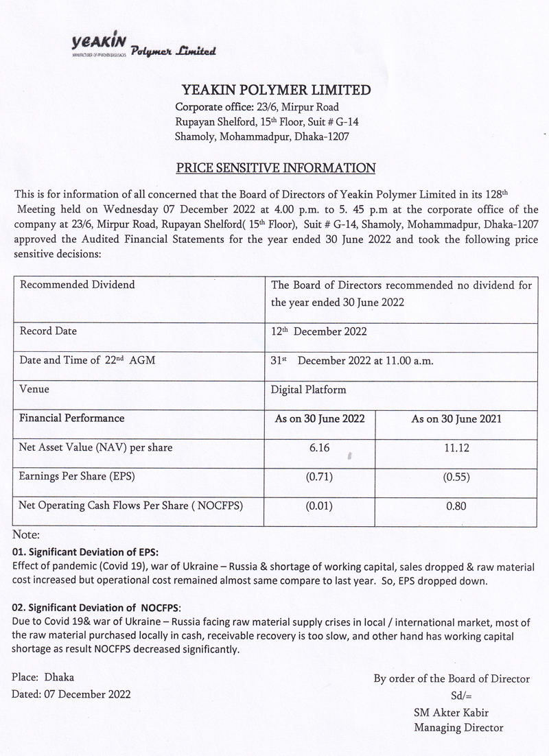 Price Sensitive Information Of Yeakin Polymer Limited