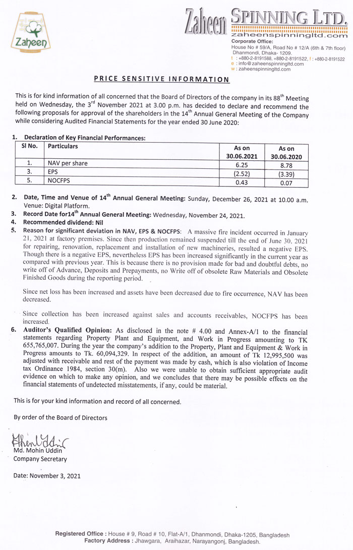 Notice of the 17th AGM of Zaheen Spinning Limited