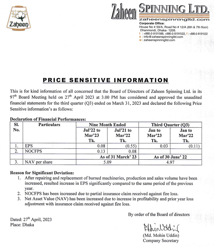 Price Sensitive Information of Zaheen Spinning Limited