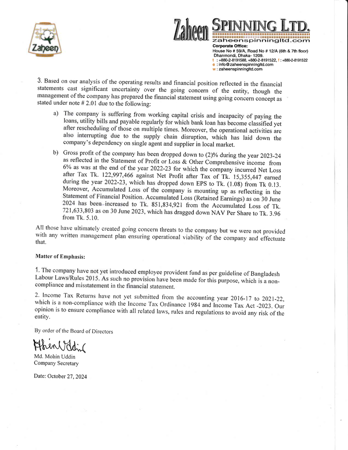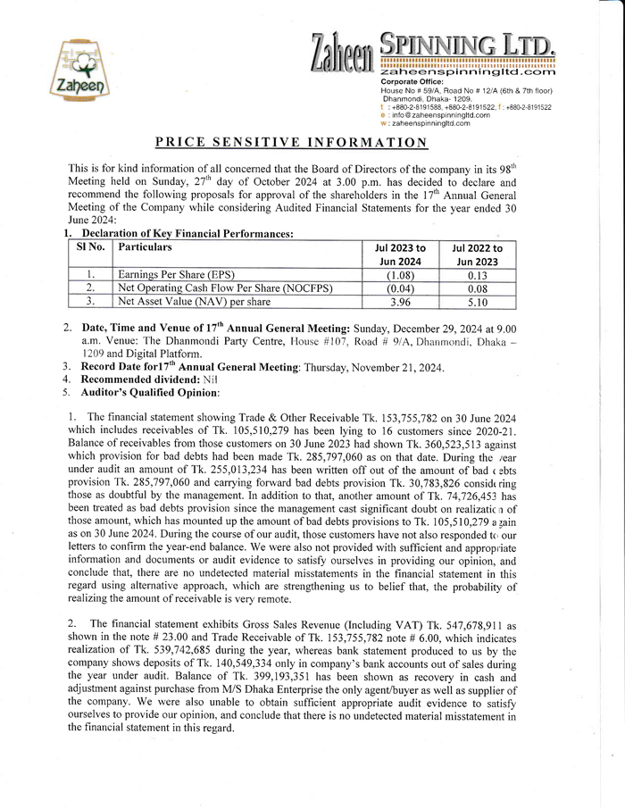 Notice of the 17th AGM of Zaheen Spinning Limited