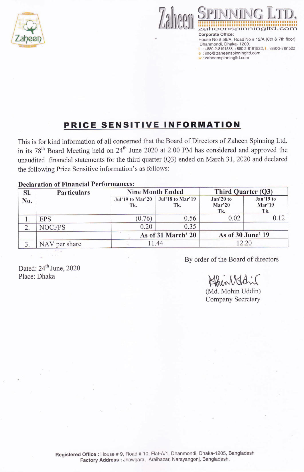 Price Sensitive Information of Zaheen Spinning Limited