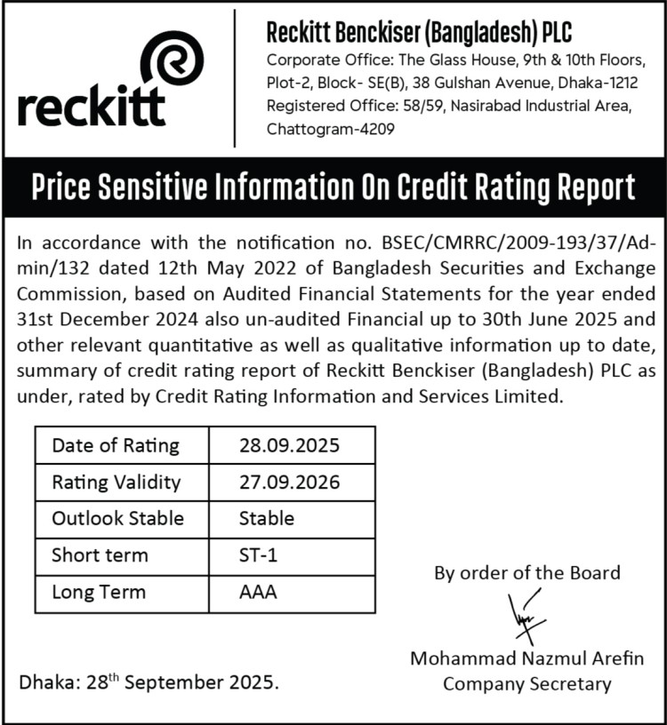 Price Sensitive Information on Credit Rating Report of Reckitt Benckiser (Bangladesh) PLC