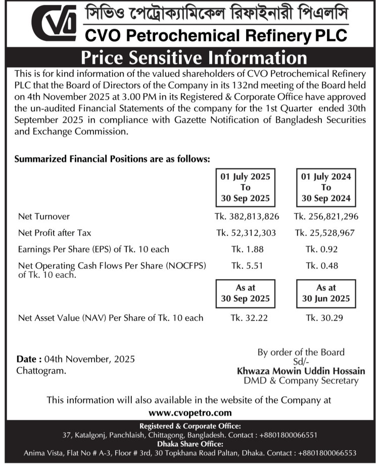 Price Sensitive Information ot CVO Petrochemical Refinery PLC