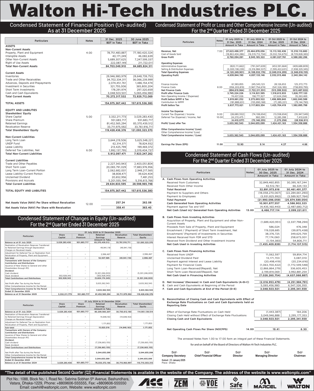 Second Quarter (Q2) Un-Audited Financial Statements of Walton Hi-Tech Industries PLC. for the Period Ended 31 December 2025.