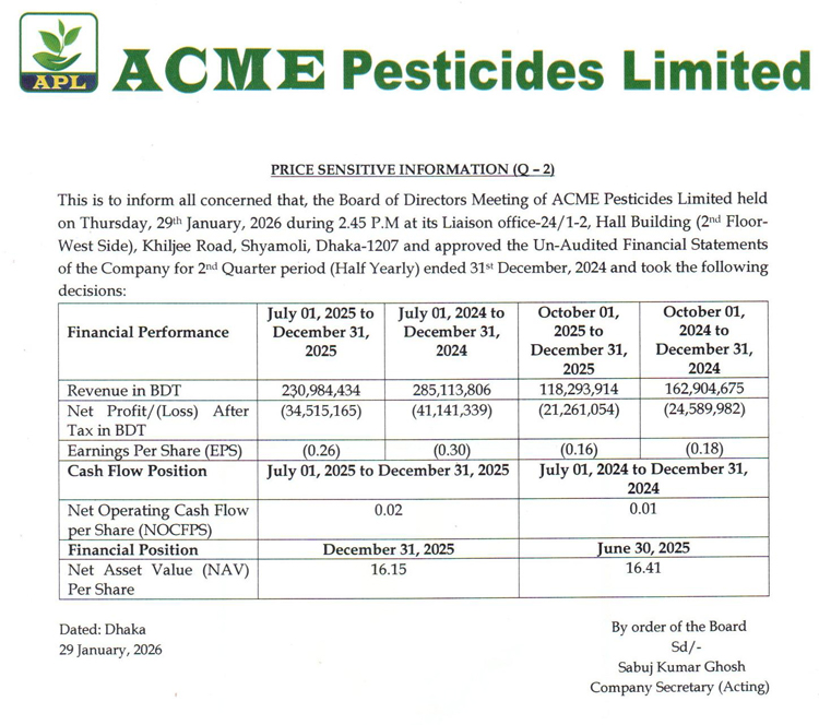 Price Sensitive Information (Q-2) of ACME Pesticides Limited