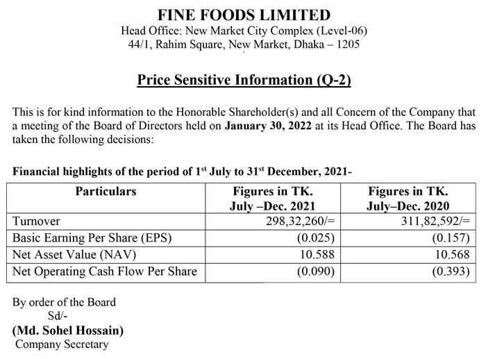 Price Sensitive Information (Q-2) of Fine Foods Limited