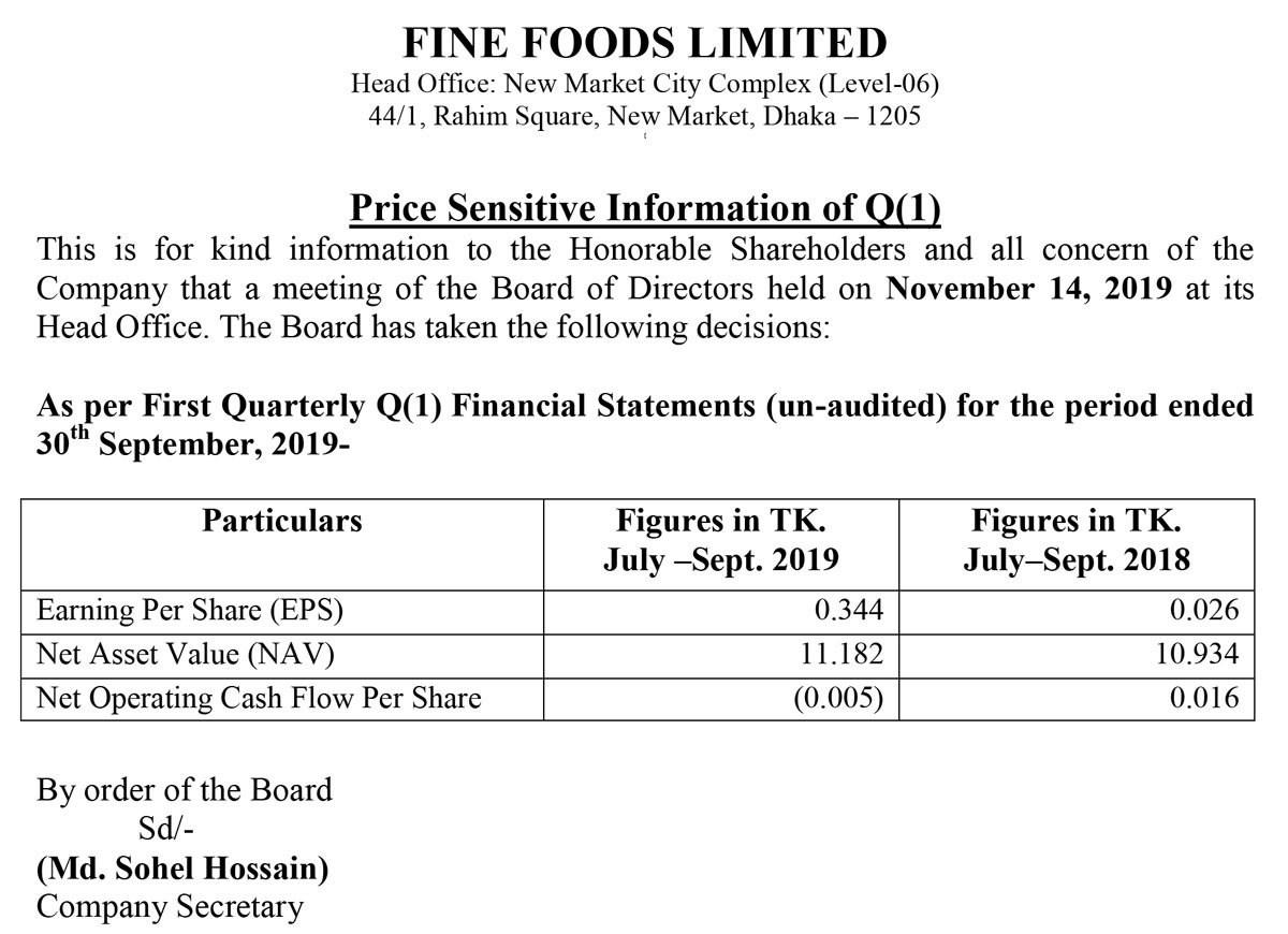 Price Sensitive Information (Q1) of Fine Foods Limited