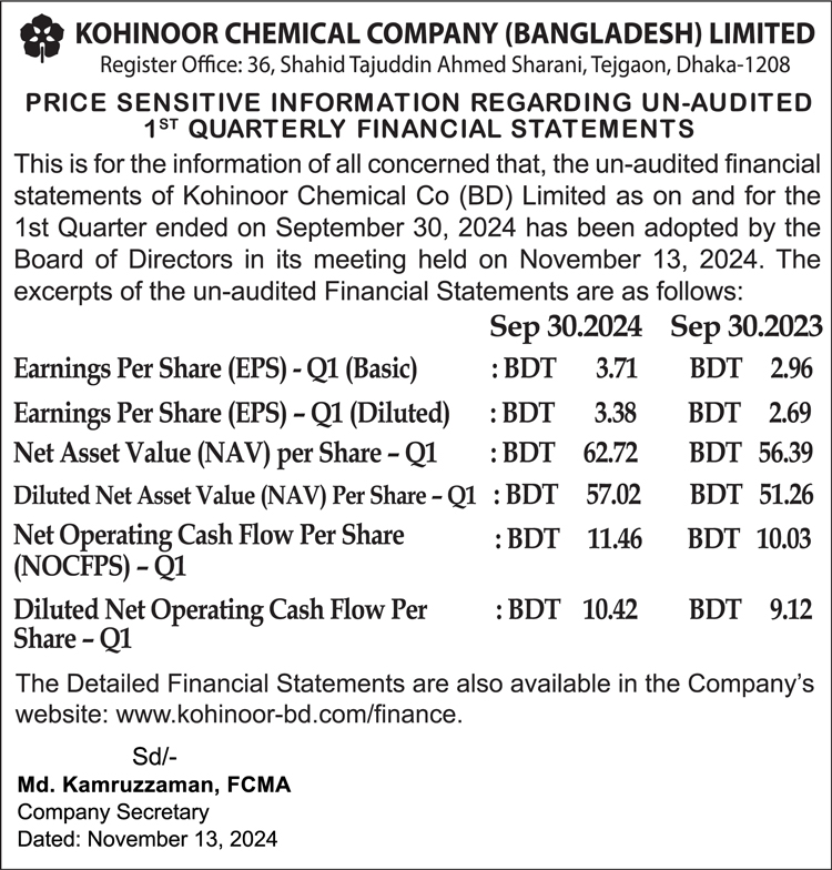 Price Sensitive Information (Q1) of Kohinoor Chemical Company (Bangladesh) Ltd.