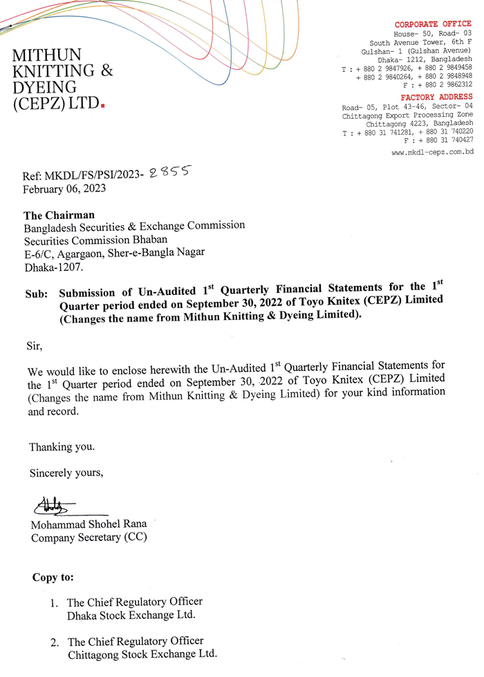 Mithun Knitting and Dyeing CEPZ Ltd. Q1 Financial Statements (Un-audited)
